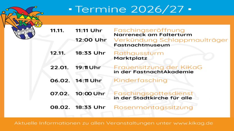 Faschingseröffnung am 11.11. um 11:11 Uhr am Faltertur– mit Verkündung des neuen Schlappmaulorden-Trägers Die diesjährige Faschingssaison startet offiziell am 11.11. um 11:11 Uhr am Falterturm in Kitzingen. Dies wird mit Spannung erwartet, da an diesem Tag der neue Träger des weiterlesen…